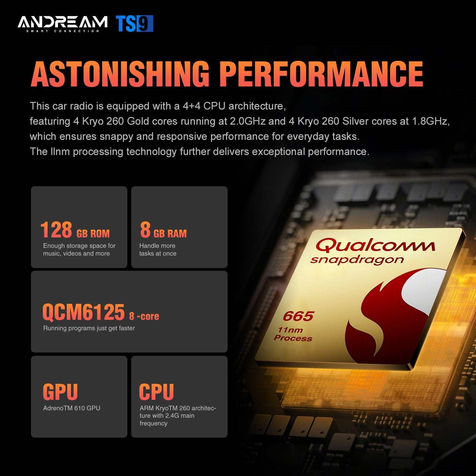 Dotato di un processore a 8 core con ottimizzazione intelligente delle prestazioni, garantisce un funzionamento fluido e reattivo, dalla riproduzione musicale all'uso quotidiano. Basato su tecnologie avanzate, offre un'esperienza in auto più veloce e fluida.